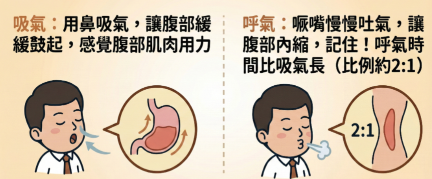 - 呼氣:噘嘴慢慢吐氣,讓腹部內縮,記住!呼氣時間比吸氣長(比例約2:1)